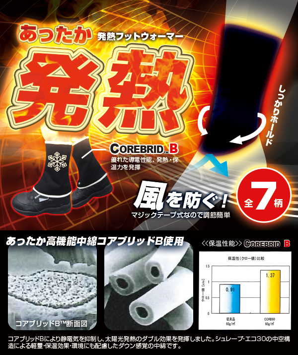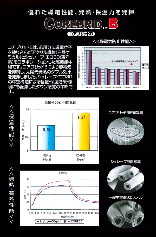 三菱ケミカルと東洋紡がコラボレーションした高機能不織布COREBRID B(コアブリッドビー)を使用。軽量で保温効果のある中綿は着け心地もフワフワ抜群です!