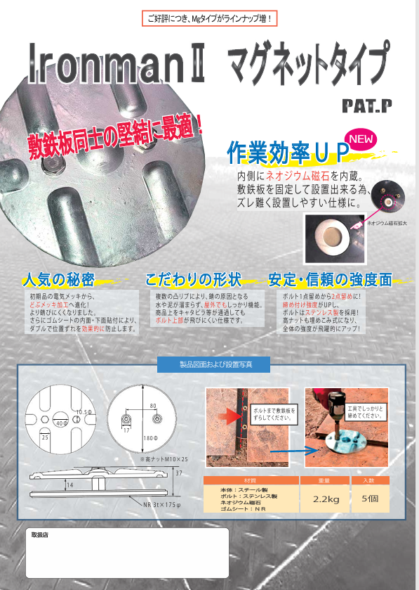 材質:本体…スチール製、ボルト…ステンレス製 ゴムシート…NR ネオジウム磁石