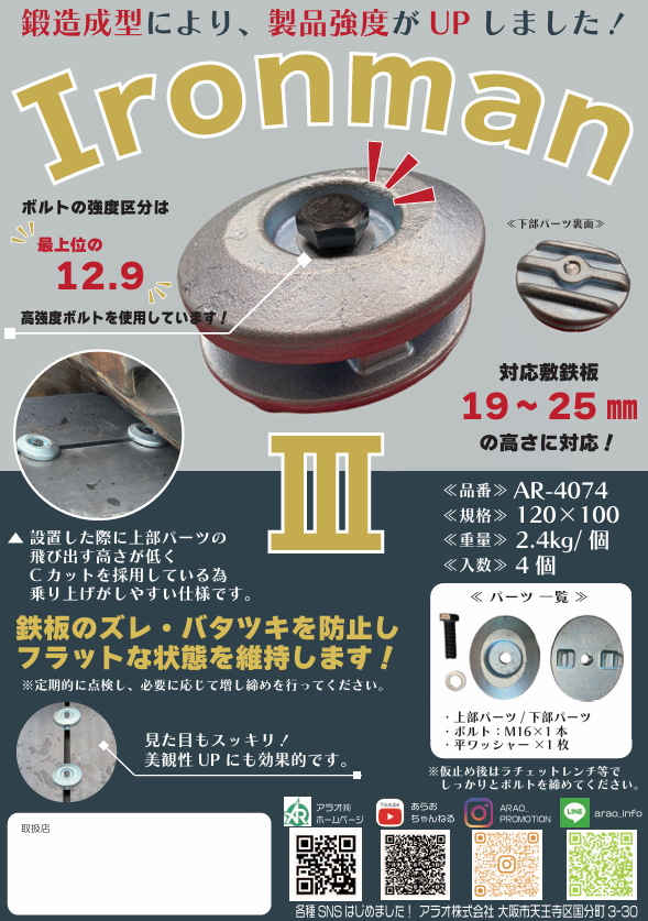 ●鍛造成型かつ高強度ボルト(M16)を採用しており、製品強度がUP!リースにも最適です。