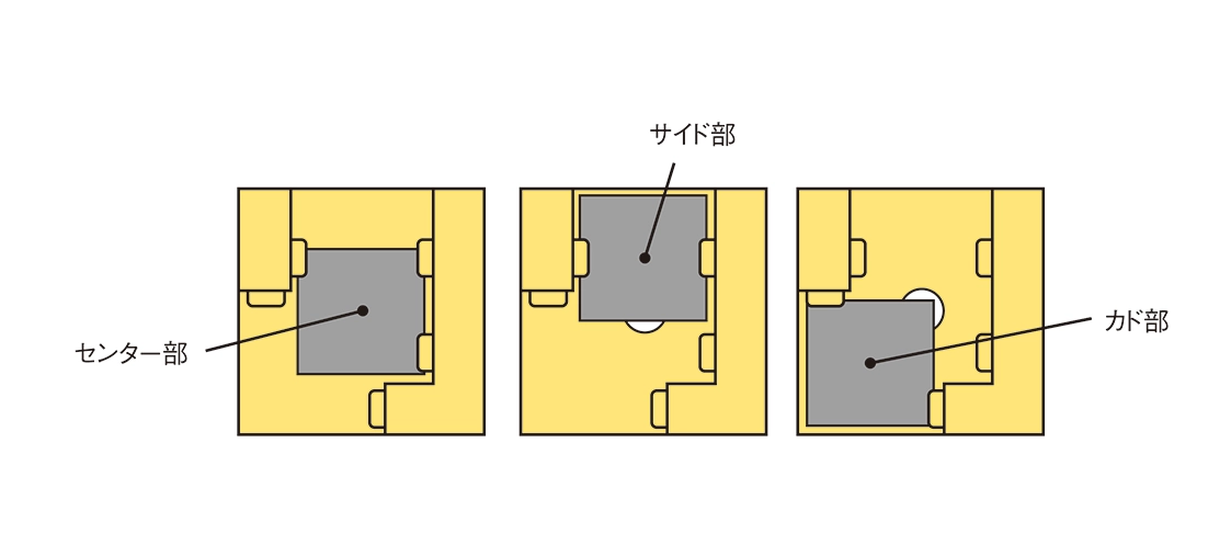 ●センター部はもちろん、カド部・サイド部の3箇所にベースをセットできます。