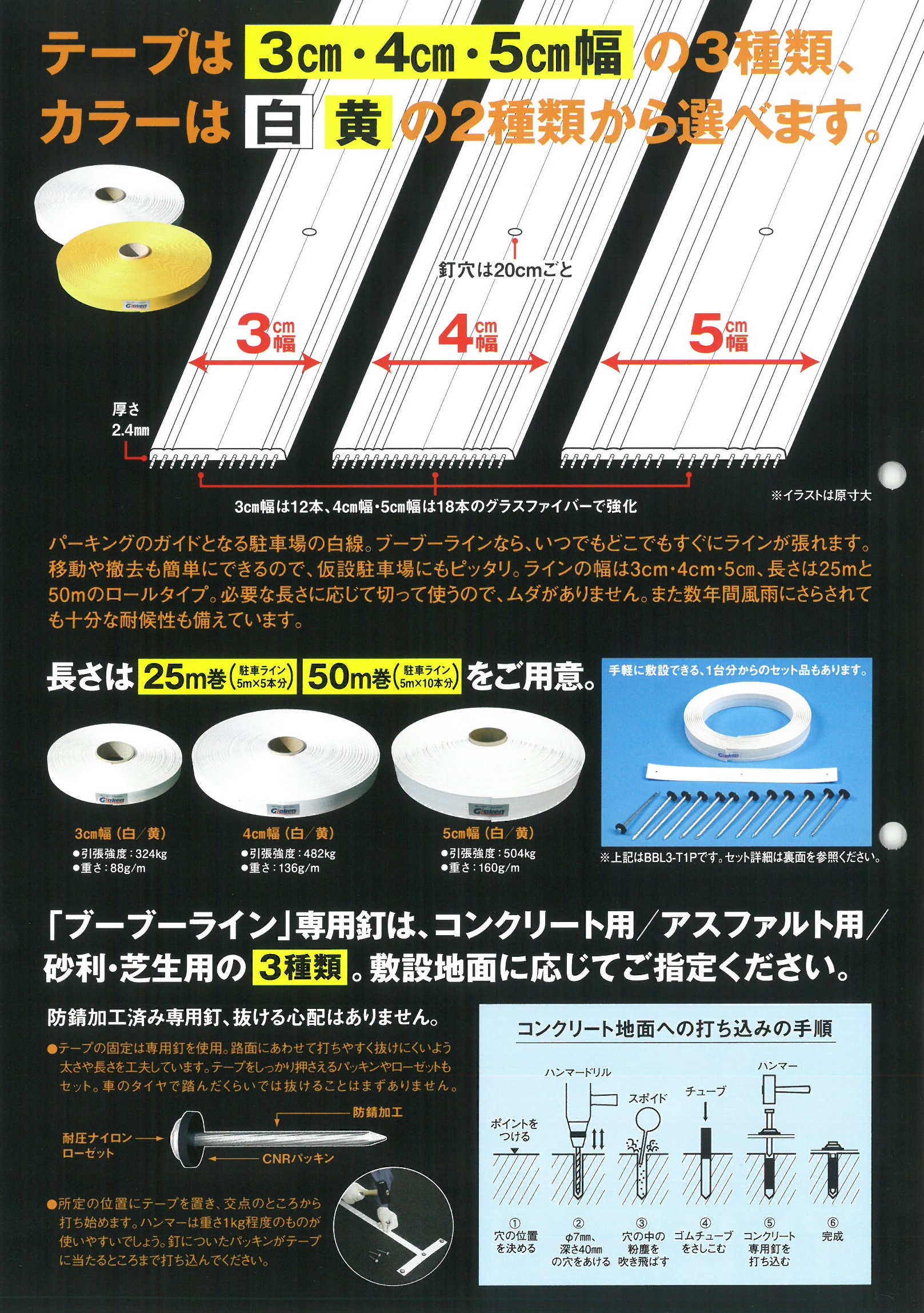 釘で固定するだけで、まっすぐキレイな黄線が引けます。トラロープよりも耐久性が高く、見た目もスッキリ。