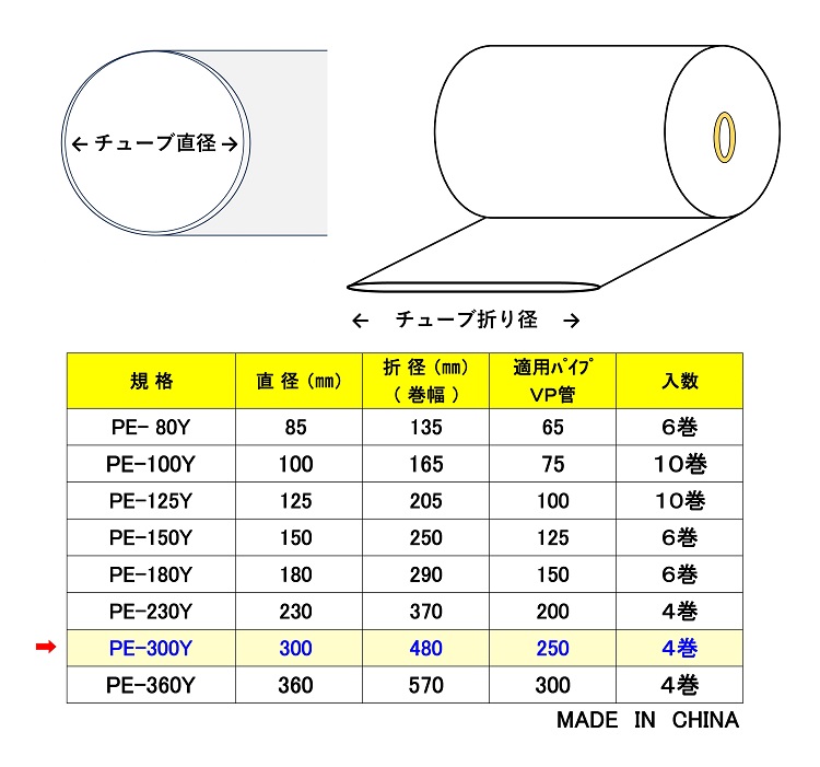 外径 約300mm(折径480mm)× 長さ50M 約0.1mm厚