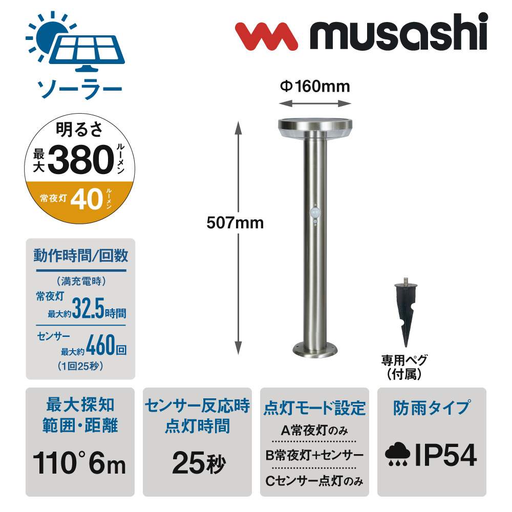 周囲が暗くなると自動点灯し、人が近づくとさらに明るく点灯するセンサー機能付き。お庭や家回りを演出するガーデンライトや防犯対策に。