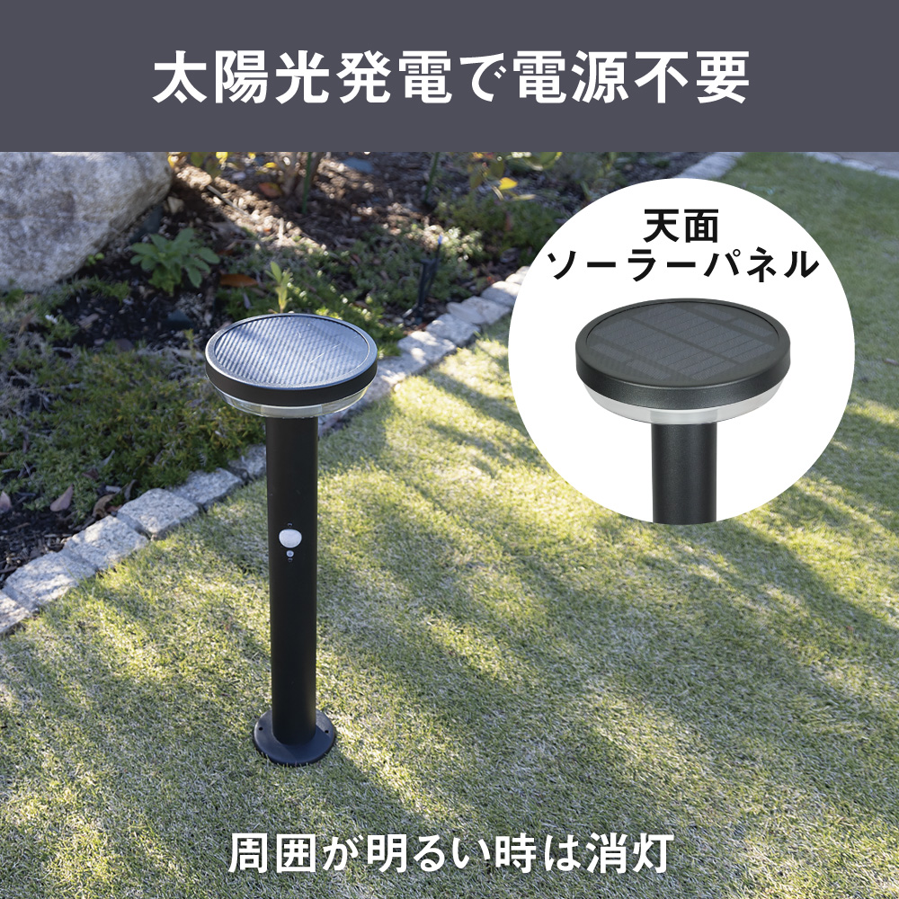 周囲が暗くなると自動点灯し、人が近づくとさらに明るく点灯するセンサー機能付き。お庭や家回りを演出するガーデンライトや防犯対策に。