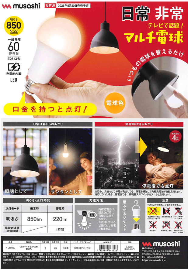 電球に充電池を内蔵し、電球単体でも点灯することができるマルチ電球です。