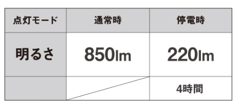 照明器具に取り付けて使用中は850ルーメンの明るさ、停電時や取り外して使用中(内蔵充電池使用中)は220ルーメンの明るさになります。