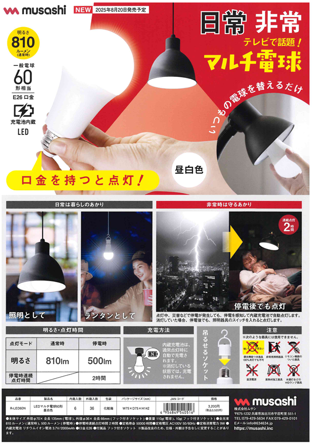 電球に充電池を内蔵し、電球単体でも点灯することができるマルチ電球です。