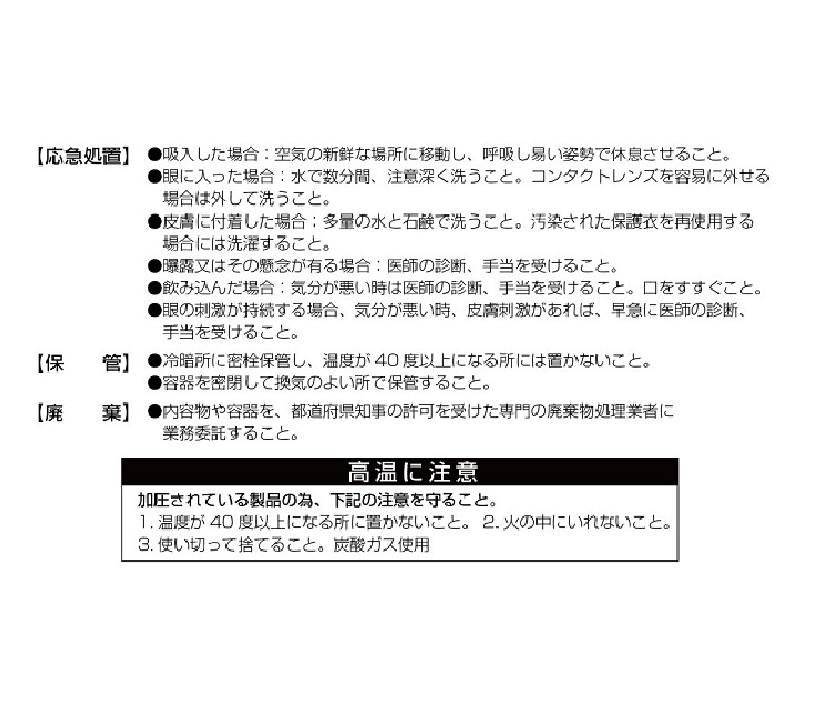 ・気温が40℃以上になる場所で保管しない様にして下さい。特にスプレータイプは高圧ガスを使用しており危険です。又、ご使用の際はすべて使い切ってから廃棄して下さい。