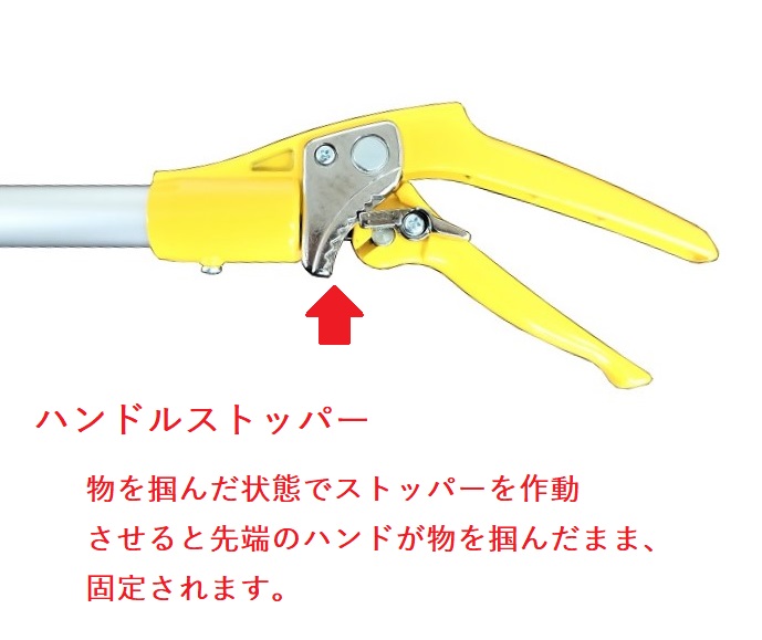 手元のハンドルで物を掴み、ストッパーで先端のハンドを固定すればハンドルから手を放しても物を掴んだままの状態でキープできます。