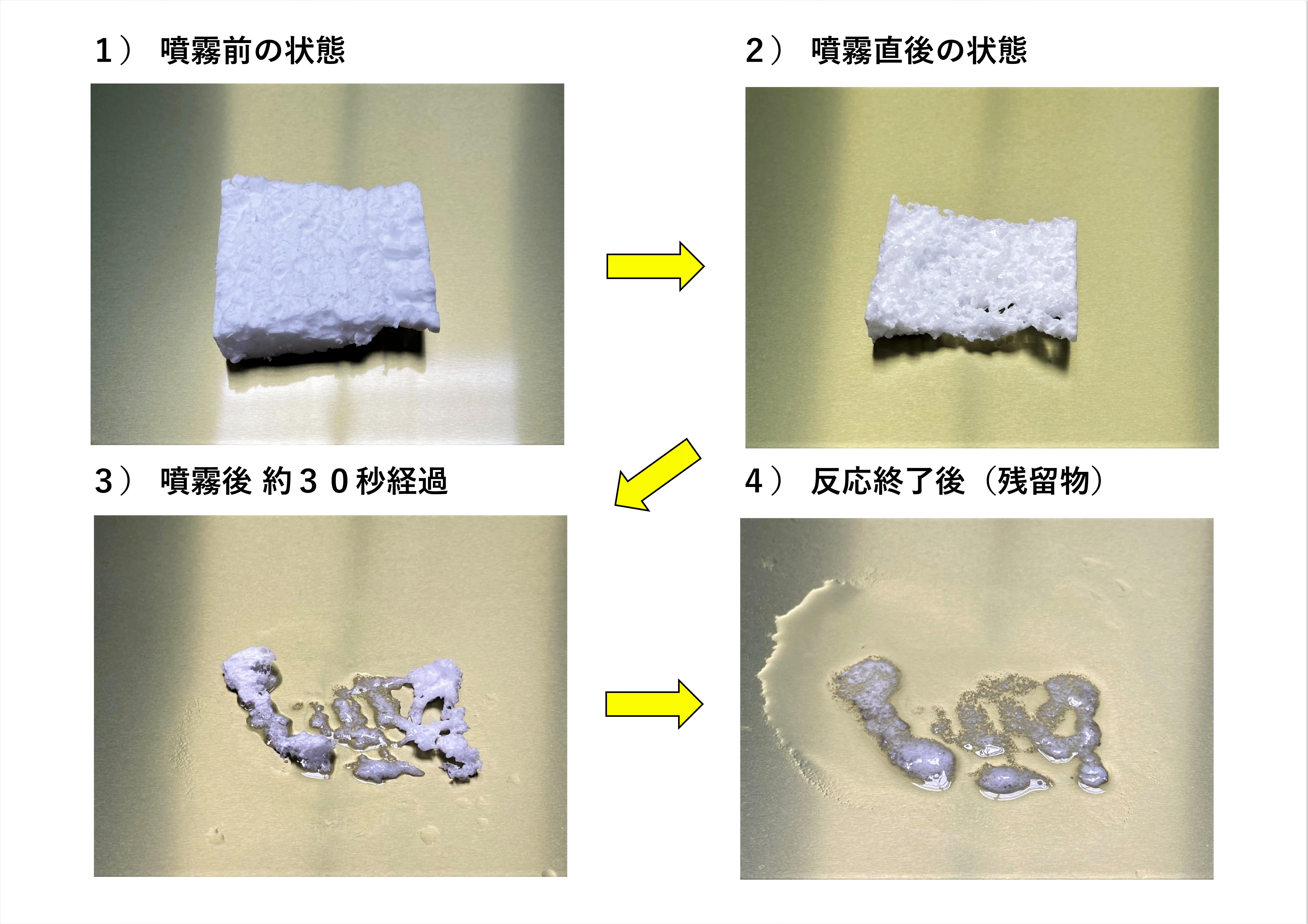 トケロールを発泡スチロールに噴霧すると、直ぐにスチロールの溶解が開始されます。発泡スチロールが溶かされ、中に閉じ込められていた空気が泡となって抜けていきます。泡立ちがなくなればそれ以上溶液を噴霧しても反応しなくなるので、乾燥する前に残留したスチロール樹脂をウェスなどで取り除いて下さい。