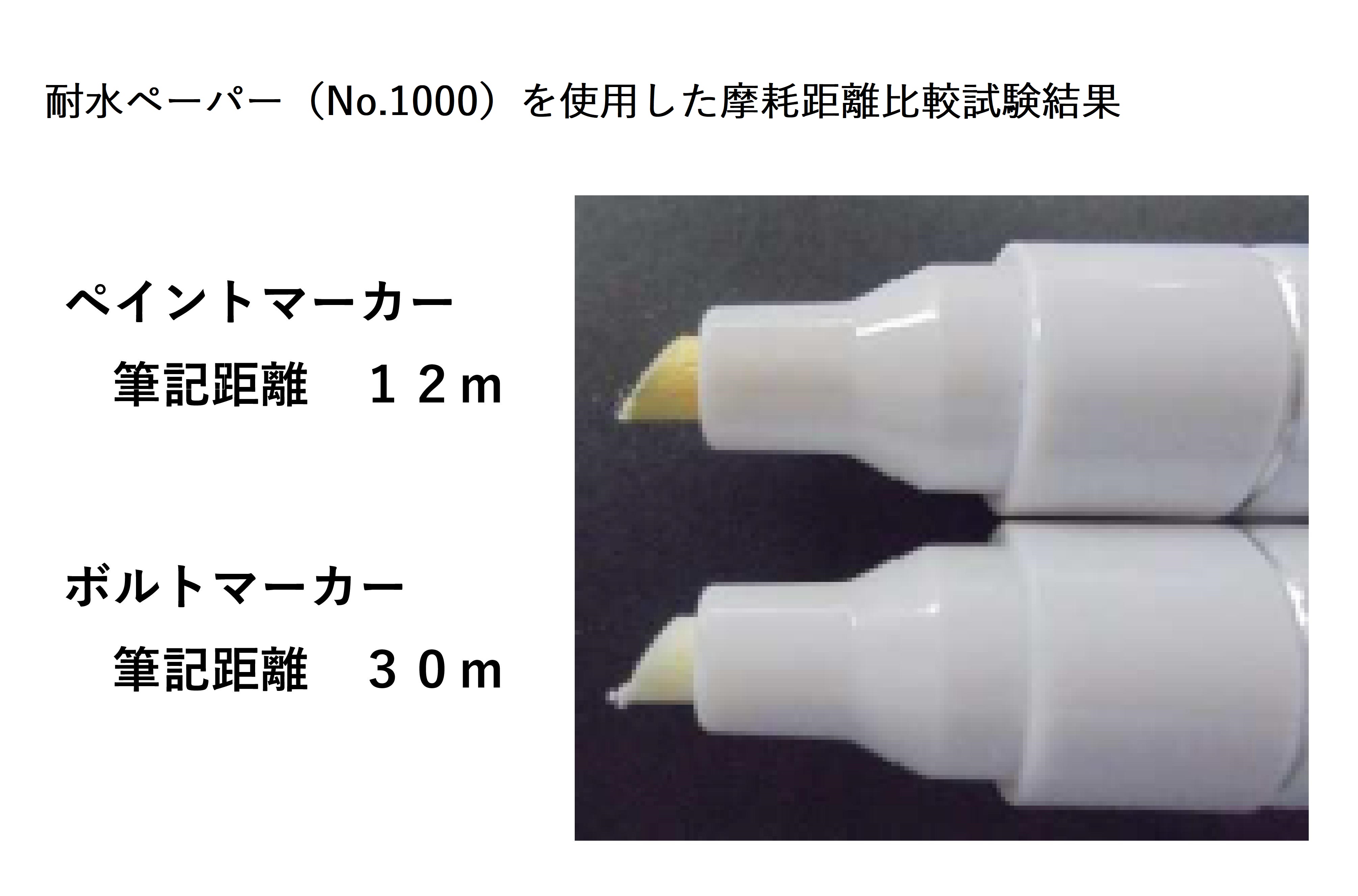 「ボルトマーカー」に使用しているペン先を市販のホワイトペイントマーカーのペン先を耐水性のヤスリ(#1,000)で摩耗テストを実施。一般品に比べ2倍以上の耐久性がある事から、インクが残った状態で使用できなる様な事もなく、最後まで使い切る事が出来る為、非常に経済的です。
