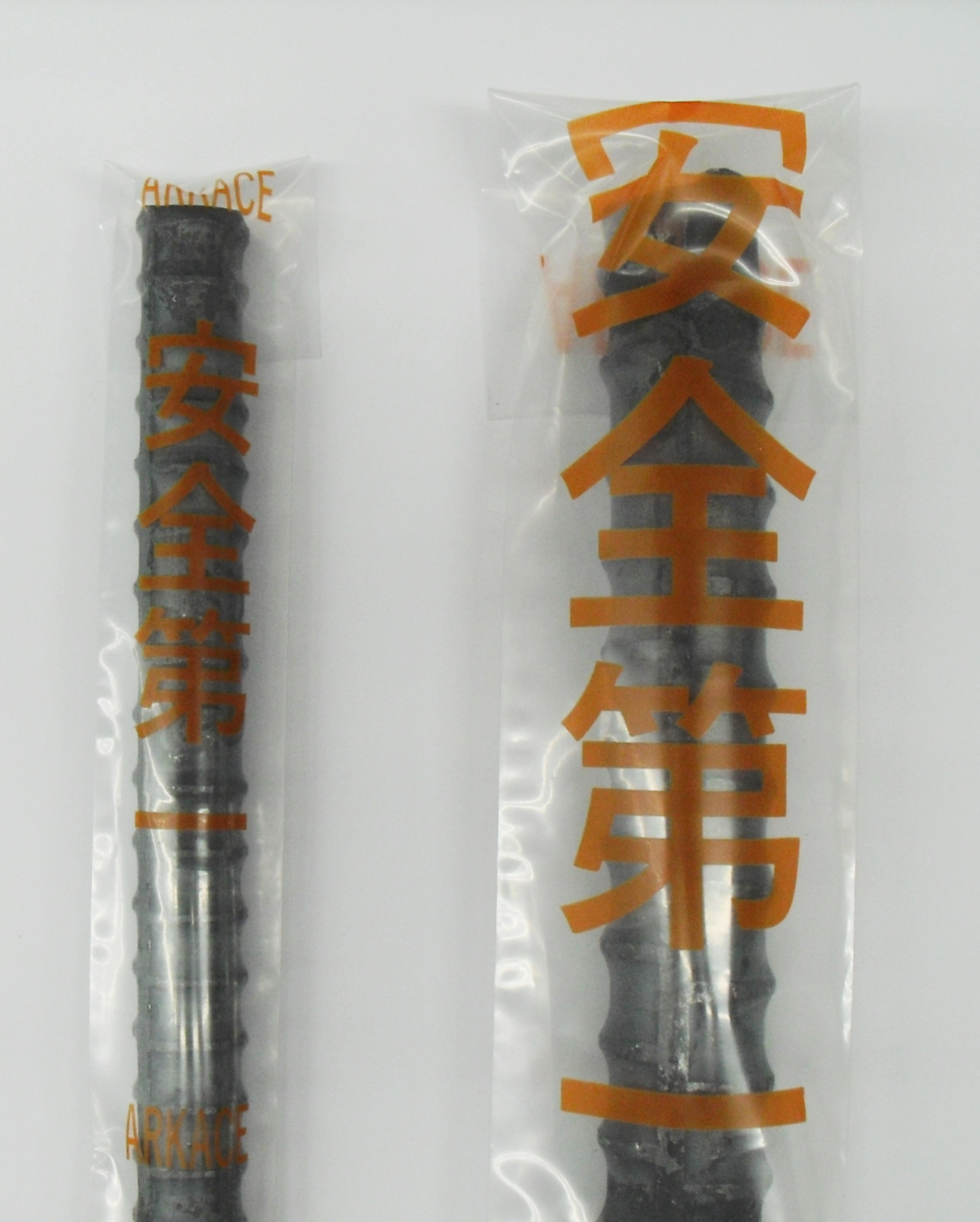 『ノロ止めチューブ』は建築作業中で外気に露出している異形鉄筋を養生するチューブです。鉄筋にコンクリートノロの付着するのを防止し、雨などで濡れてサビが発生するのを予防する効果があります。チューブ本体にも『安全第一』の文字を印刷しており、工事現場の安全確保にも一役買います。チューブなのでハサミなどで簡単にカットでき、必要な長さに調整しやすくなっています。
