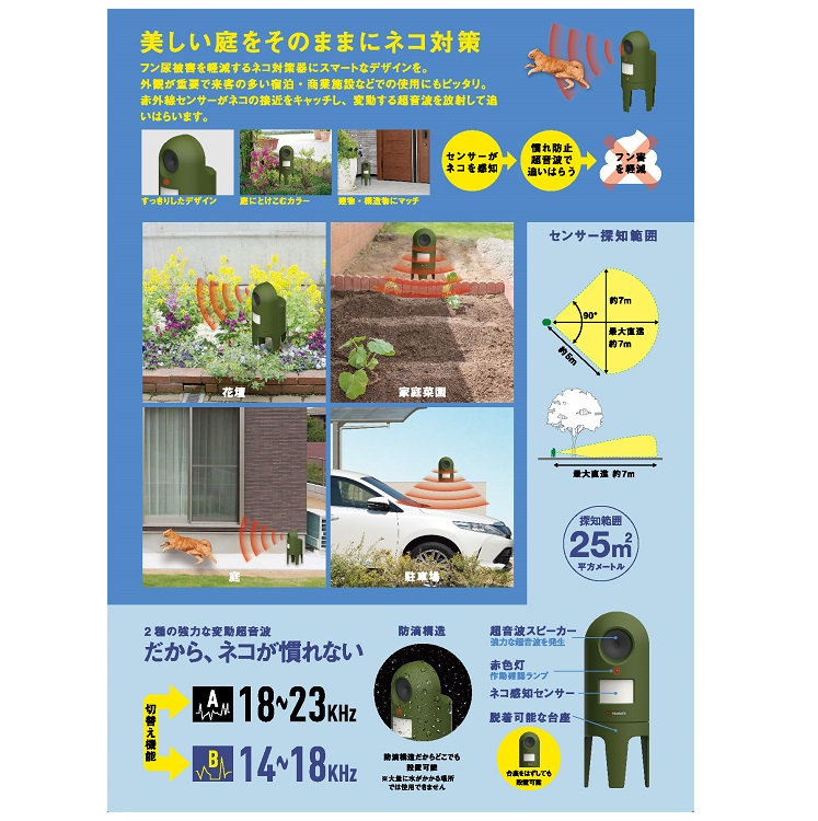 ネコが嫌がる超音波を感知センサーで自動検知して超音波を放射します。超音波の種類も2種類ある為、ネコが慣れるのを防止できます。ご家庭での使用だけでなく、外観やイメージ改善が必要な店舗・宿泊施設等での使用にもピッタリです。