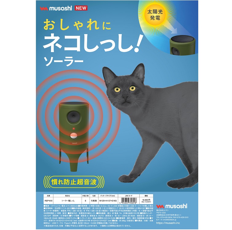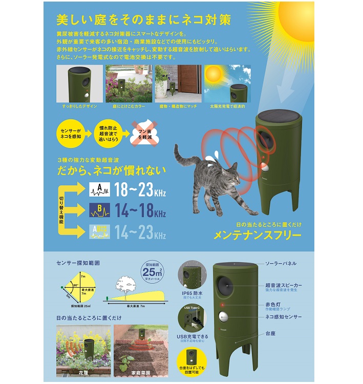 ネコが嫌がる超音波を感知センサーで自動検知して超音波を放射します。ソーラー充電タイプの為、電池交換などの手間がかかりません。超音波の種類も3種類ある為、ネコが慣れるのを防止できます。ご家庭での使用だけでなく、外観やイメージ改善が必要な店舗・宿泊施設等での使用にもピッタリです。本体は緑色なので自然の中に溶け込みやすく目立ちません。